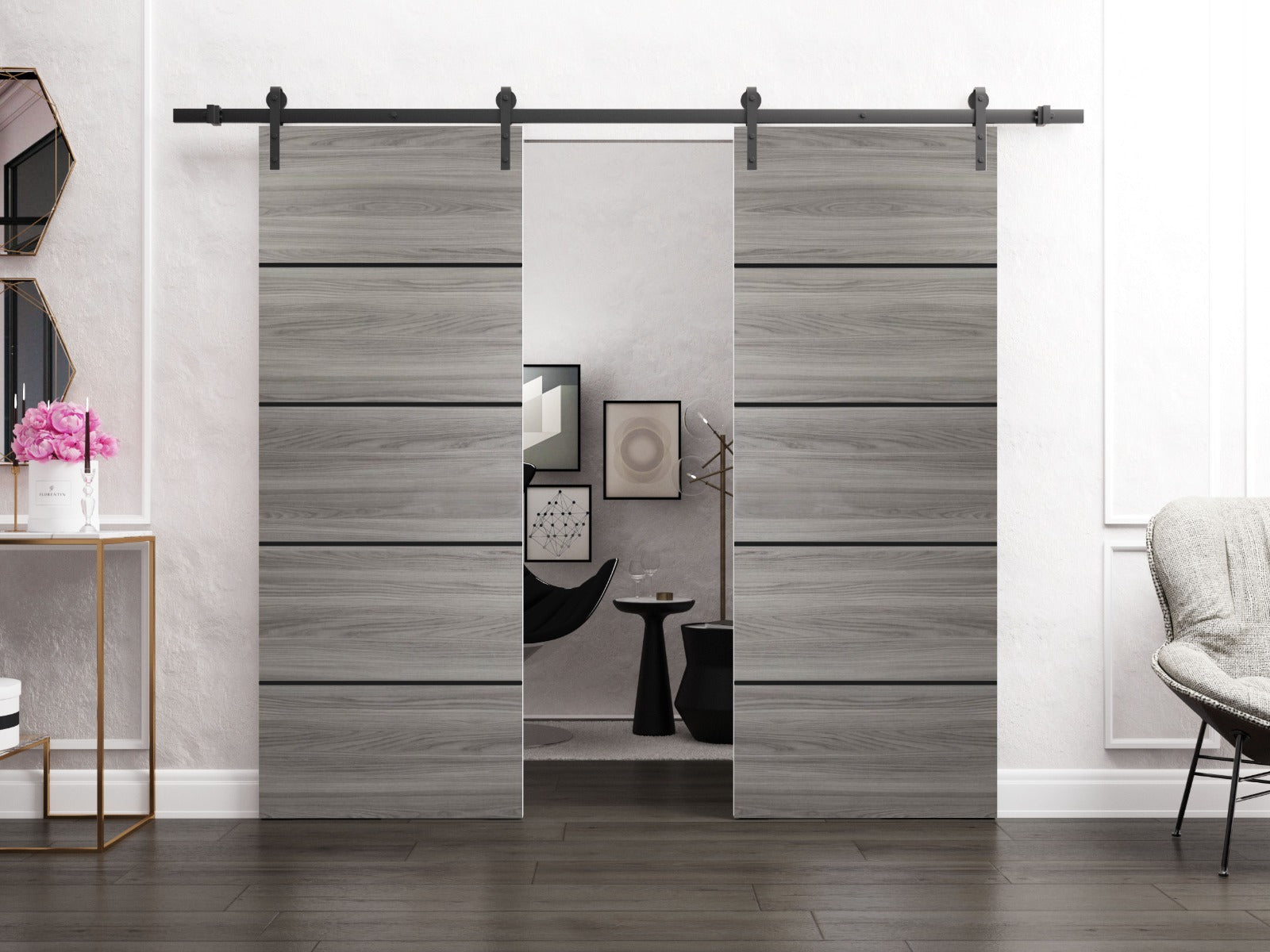 Upgrade your space with these modern gray sliding barn doors, featuring a sleek horizontal panel design. The light gray wood finish adds a touch of sophistication and blends effortlessly with contemporary, industrial, or minimalist interiors.